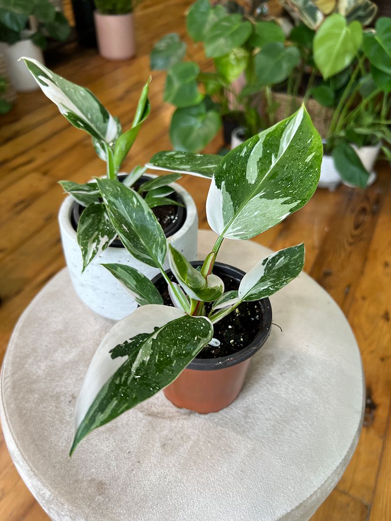 The Crazy Plant Shop Al igual que la Princesa Rosa, la Princesa Blanca Philodendron es una de las plantas más raras disponibles. Es originaria de Centro y Sudamérica. Sus hojas de color verde brillante tienen distintos grados de variegación blanca dependiendo de cómo se haya cultivado. Además, sus tallos de color rojo son jaspeados. Una vez que consigas cubrir las necesidades lumínicas de esta planta, no debería resultar difícil cultivarla.- Nombre botánico: Philodendron erubescens “Princesa Blanca”